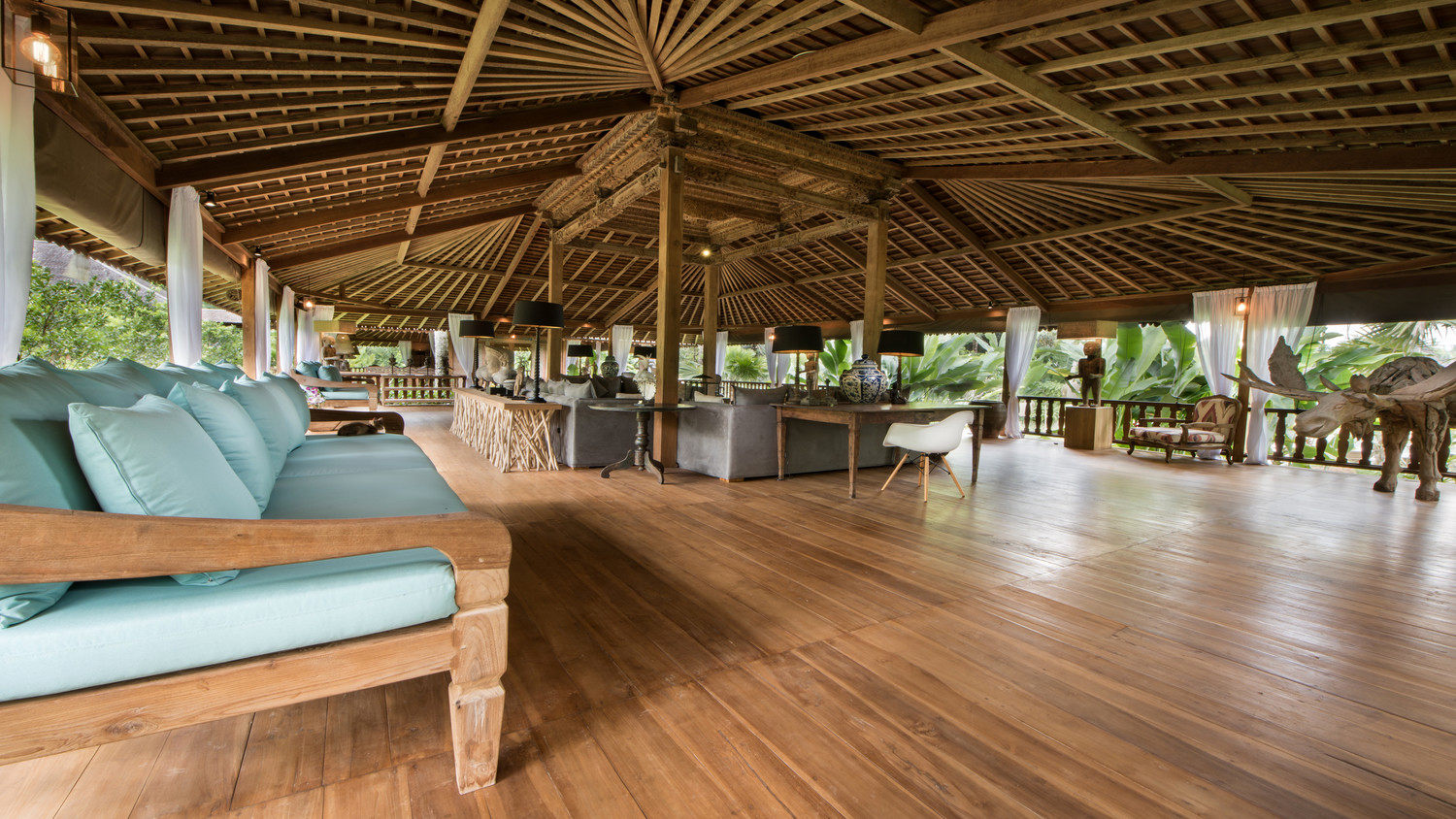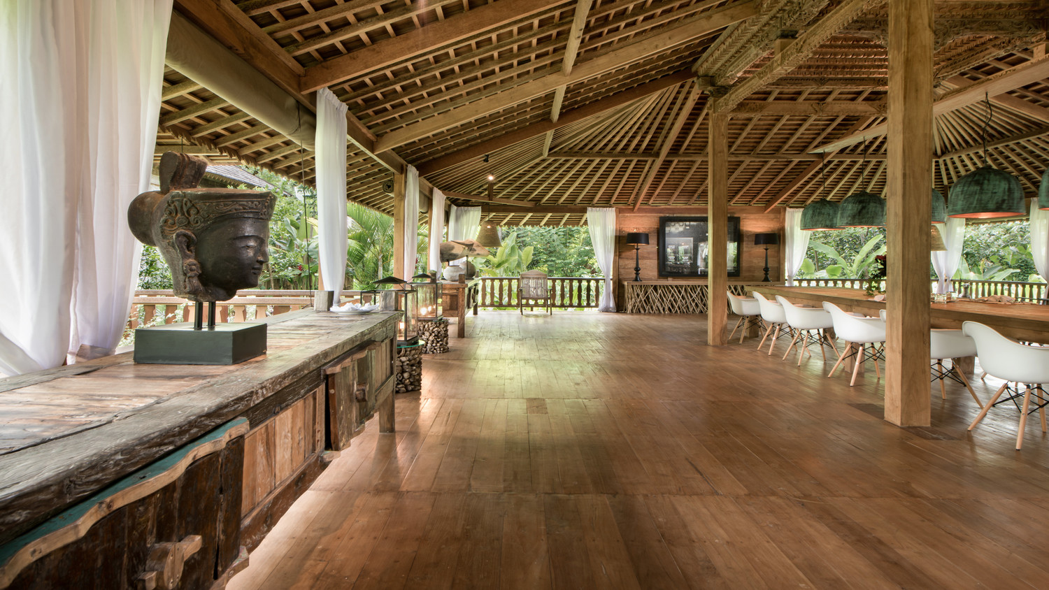 Гостиная представляет собой просторный открытый павильон с тремя большими диванами, расположенными вокруг красиво вырезанного журнального стола, установленного под аутентичным яванским сводом Joglo. Комната украшена уникальными произведениями искусства и антиквариатом. Из гостиной лестница ведет к основному бассейну.